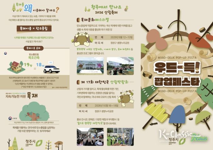 K-Classic News 기자 | 청주시는 오는 5월 7일부터 10일까지 청원구 생명누리공원에서 목재문화 체험행사 ‘우드-득! 팝업페스타’를 운영한다고 밝혔다.