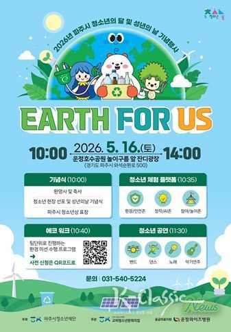 K-Classic News 기자 | 파주시청소년재단 교하청소년문화의집에서는 청소년의 건강한 성장과 성년의 의미를 되새기기 위해 2026년 5월 16일 '청소년의 달 및 성년의 날 기념행사 ‘EARTH FOR US’'를 개최한다.