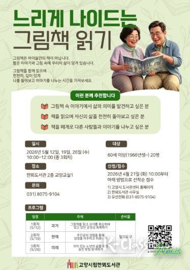 K-Classic News 기자 | 고양특례시 한뫼도서관은 오는 5월 시니어 대상의 독서문화 프로그램 ‘느리게 나이드는 그림책 일기’를 진행한다.