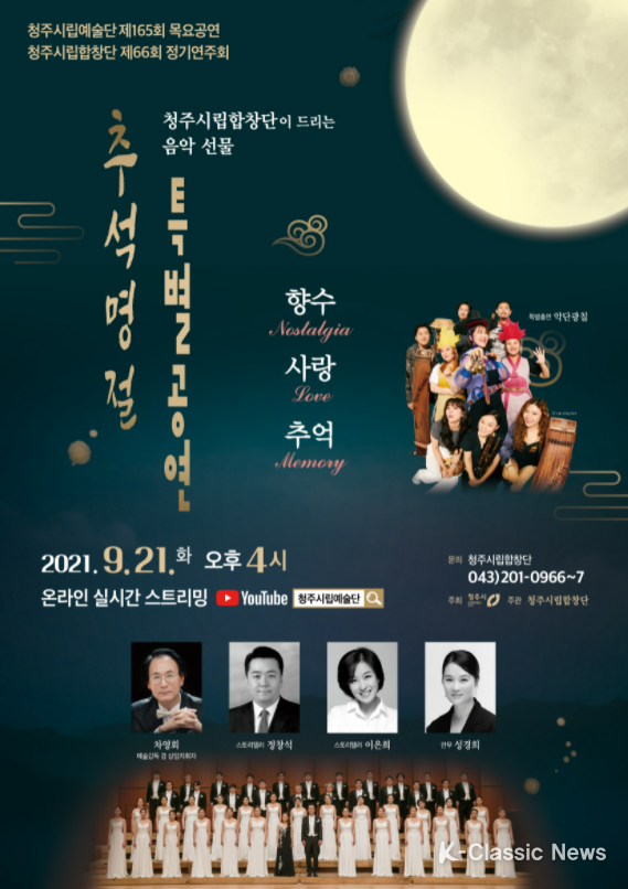 K-Classic News 김지민 기자 | 청주시립합창단은 민족 대명절 추석을 맞아 추석 당일인 21일 오후 4시 제66회 정기연주회 ‘추석명절 특별공연’을 유튜브 청주시립예술단 채널을 통해 실시간 선보인다.