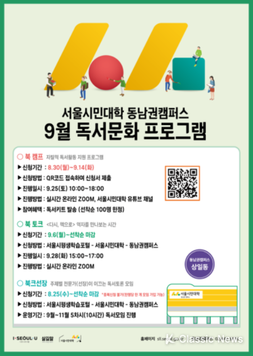 K-Classic News 김지민 기자 | 독서의 달 9월을 맞아 서울시민대학이 △북 캠프 △북 토크 △북크 선장 등 특색 있고 다양한 독서문화 프로그램을 진행한다. 이는 시민들이 다양한 방식으로 책 읽기의 즐거움을 느끼며 주도적인 독서 활동을 지속할 수 있도록 하기 위해 마련됐다.