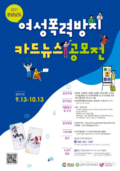 K-Classic News 김지민 기자 | 경상남도와 창녕성·건강가정상담소·1366경남센터는 여성폭력 예방과 인식 개선을 위해 경상남도 청소년을 대상으로 ‘여성폭력방지 카드뉴스 공모전’을 개최한다고 밝혔다.
