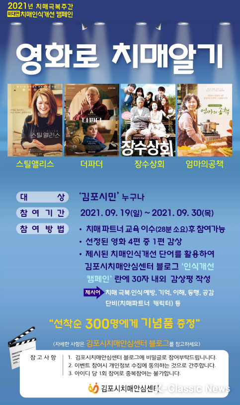 K-Classic News 김지민 기자 | 김포시보건소 치매안심센터에서는 제14회 치매극복의 날 기념 치매극복주간에 비대면 치매인식개선 챔페인 『영화로 치매알기』을 오는 9월 19일부터 9월 30일까지 진행한다.