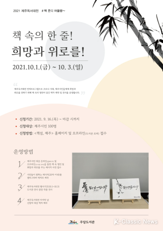 K-Classic News 김지민 기자 | 제주시 우당도서관에서는 제주독서대전 연계프로그램으로 희망과 위로를 전하기 위해 책 속의 명언이 담긴 캘리그라피 액자를 제작 및 배부하는‘책 속의 한 줄! 희망과 위로를!’ 프로그램을 운영한다고 밝혔다.