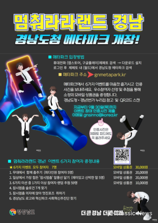 K-Classic News 김지민 기자 | 경남도는 메타버스(확장 가상 세계) 플랫폼을 활용한 코로나19 확산 방지 ‘잠시멈춤’ 캠페인 ‘멈춰라라랜드 경남!’을 오는 30일까지 개최한다.