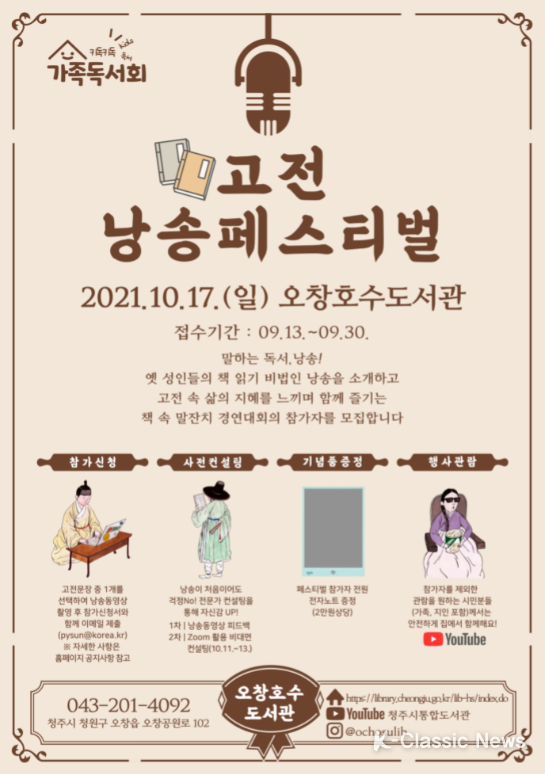 K-Classic News 김지민 기자 | 청주오창호수도서관이 키독키독 가족독서회 행사의 일환으로 2021년 10월 17일 13시에 오창호수도서관 3층 대강당에서 개최되는 고전낭송 페스티벌의 참가자를 2021년 9월 30일까지 모집한다.