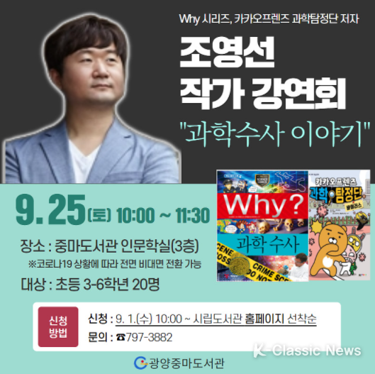 K-Classic News 김지민 기자 | 광양중마도서관이 독서의 달을 맞아 오는 25일 오전 10시 조영선 작가를 초청해 ‘과학수사’라는 주제로 특강을 운영한다.