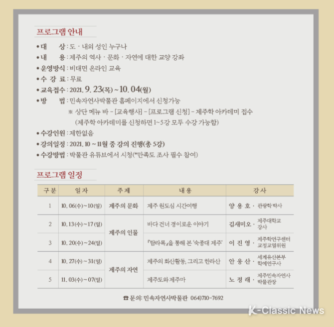K-Classic News 김지민 기자 | 제주특별자치도 민속자연사박물관(관장 노정래)이 성인대상 교육 프로그램인 2021년 <제주학 아카데미>를 운영한다.