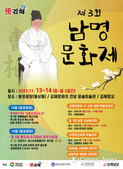 K-Classic News 최혜정 기자 | 김해시는 제3회 김해 남명문화제를 13. 14일 양일간 분성광장(분성로335번길 30일원)에서 개최한다고 밝혔다.