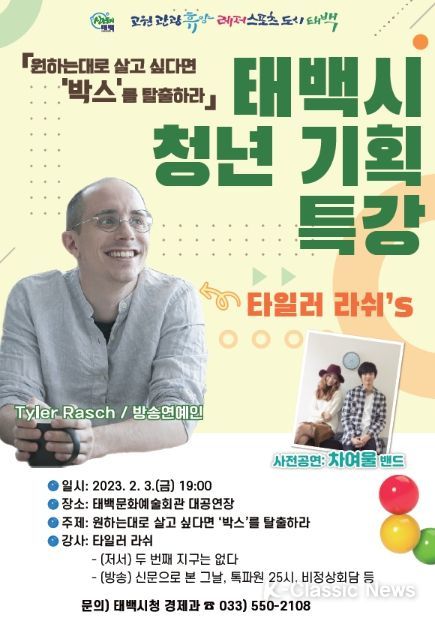 강연을 맡은 타일러 라쉬는 비정상 회담, 신문으로 본 그날 등 다수의 방송 출연과 여러 대학의 지식향연, 인문학 특강 등을 진행한 강사이다. 특강에는 청년은 물론 강의에 관심 있는 태백시민이라면 누구나 무료로 참석할 수 있다.