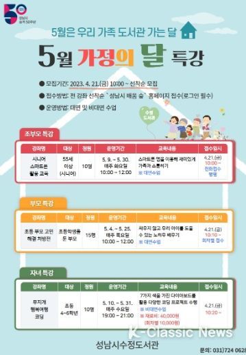 K-Classic News 최지은 기자 | 성남도시개발공사가 운영하는 수정도서관이 5월 가정의 달을 맞아 오는 4일부터 31일까지 가정의 달 행사를 운영한다고 3일 밝혔다.