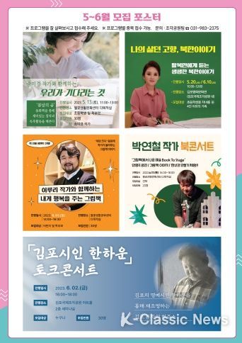 이번에 모집하는 5월과 6월 프로그램은 어린이 동화책 ‘봄 날의 곰’ 작가로 유명한 송미경 작가와 ‘까만 코다’ 작가로 잘 알려진 이루리 작가와 함께하는 ▲작가와의 만남, 인형극/체험/강연이 한데 어우러진 ▲박연철 작가 북콘서트, 탈북민에게 듣는 생생한 북한이야기 ▲나의 살던 고향, 북한이야기, 김포의 명예시인 ‘한하운’을 통해 김포 문학의 현주소를 알아보는 ▲'김포시인 한하운' 토크콘서트 등 다양한 프로그램들이 진행될 예정이어서 시민들이 관심 가져볼만 하다.