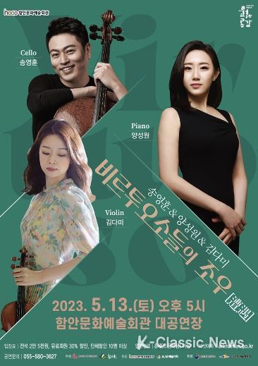 K-Classic News 최지은 기자 | 함안문화예술회관은 오는 13일 오후 3시 예술회관 대공연장에서 송영훈&양성원&김다미 ‘비르투오소들의 조우(遭遇)’ 공연을 선보인다.