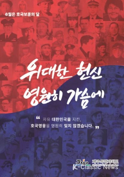 K-Classic News 김성연 기자 | 제주특별자치도 보훈청은 6월 호국보훈의 달을 맞아 호국영웅을 기억․추모․감사하고자 '위대한 헌신, 영원히 가슴에'라는 주제로 현충일 추모식, 6․25전쟁 기념행사 등 다양한 보훈행사를 도 일원에서 개최한다.