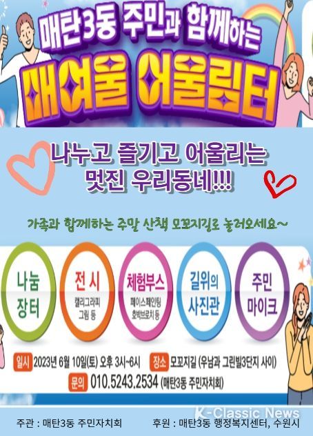 K-Classic News 진금하 기자 | 오는 10일 수원시 매탄3동 주민자치회가 주최하는 ‘매여울 어울림터’행사가 매탄3동 모꼬지길(우남퍼스트빌 아파트와 주공 그린빌 3단지 사이길)에서 열린다.
